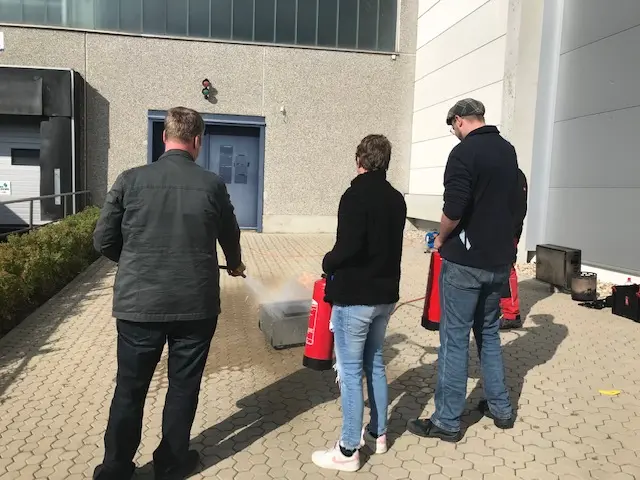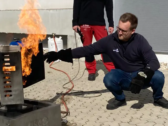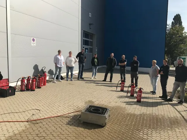 IAS Arbeitsschutz-Dienst vermittelte grundlegende Theorie zu Brandklassen und Löschmethoden. Kleebauer ließ uns im Anschluss das Gelernte in praxisnahen Übungen umsetzen, inklusive Feuerlöscher-Training und Evakuierungsprozeduren.
